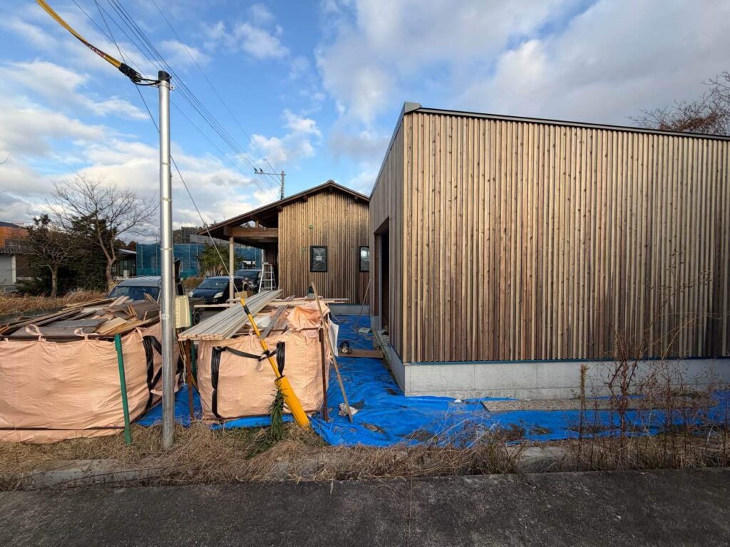 二森の家、外壁が少しずつ仕上がってきました。外壁は杉板の縦張りに、押し縁で、母屋と、ご主人様のお仕事の離れどちらも、同じ仕上がりで統一していきます。二森の家では、住まいの形に合わせ、押縁の間隔を通常150mmを75mmへと間隔と短くすることにより、より細かく伸びるストライプのように上品に仕上げいきます。
