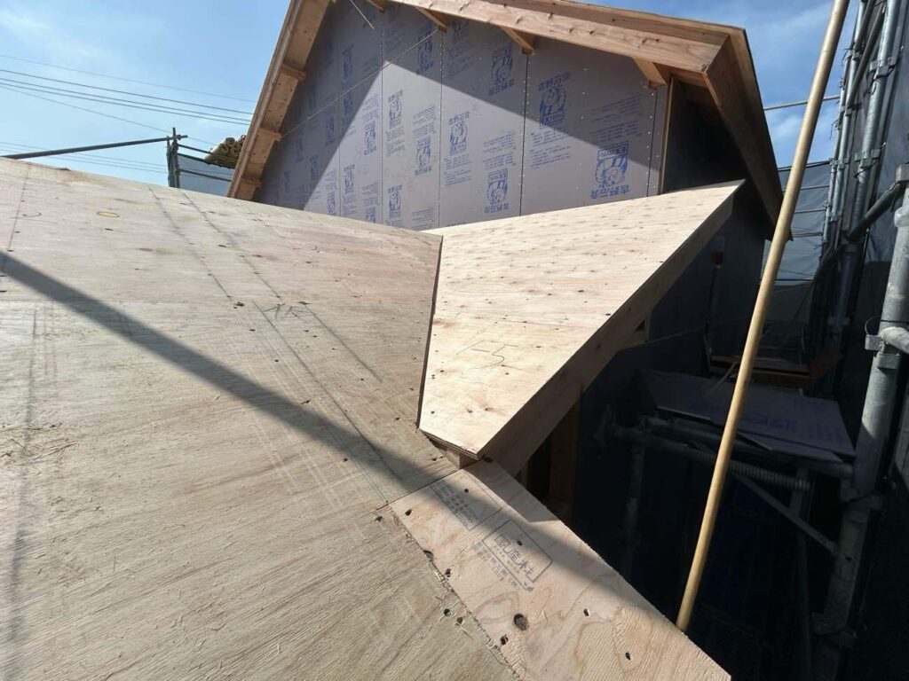 東小田の家、上棟を終え屋根ができました。切妻屋根が見る角度によって様々な表情を見せてくれます。屋根によって住まいの形の比率が大きく変わり、外からの表情が多種多様になります。今回の東小田の家では、南欧プロヴァンスのような住まいになります。しかし、南欧プロヴァンスのスタイルに合わせていくのではなく、あくまでご家族の暮らしにスタイルを取り込んでいき、「東小田の家ならでは」に変えていきます。まず建築でよく使用される屋根勾配4寸(約21°)よりも、6寸(約30°)にしております。室内空間の広さや、住まいの形の比率が変わり、通常の南欧プロヴァンスとは表情が変わります。また背面からみたシンプル切妻から、正面にまわると複雑な切妻になっており、外出から住まいに帰ってきたときに見る、ひとつの愉しみになるようにしています。屋根材はウッドシェイクといった、厚みのある屋根材で南欧の伝統と、様々な色合いを愉しむことができます。ご家族様の好きやこうしたいといった事を追求し、暮らしの愉しみに変えていき、本日も想建中です。