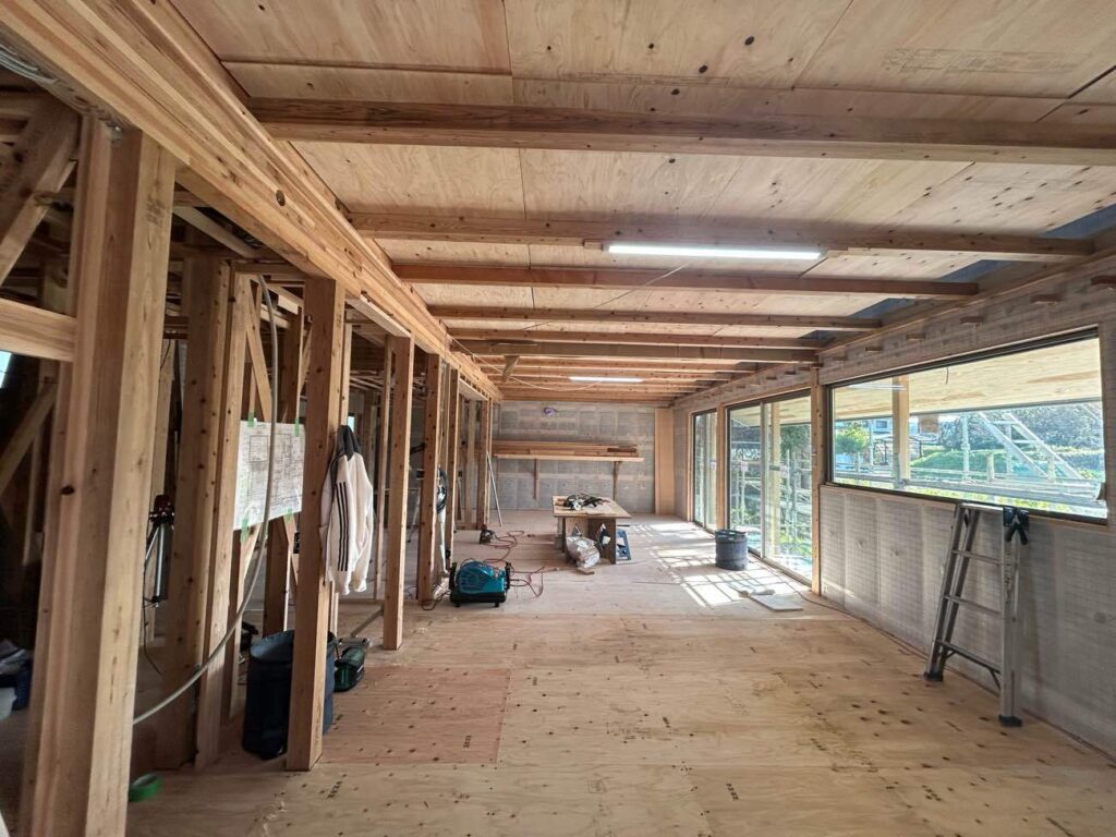 今はまだ天井のように仮足場が並ぶリビングでは、二階まで吹き抜けるようになり、どこにいても暖炉の温かさを感じるようになります。床暖房やトリプルサッシなど機能を足すのでなく、本来の陽や火の暖をより感じるつくりで暮らしの心地よさを生み出します。少しずつ住まいが温かくなるのを感じながら本日も想建中です。