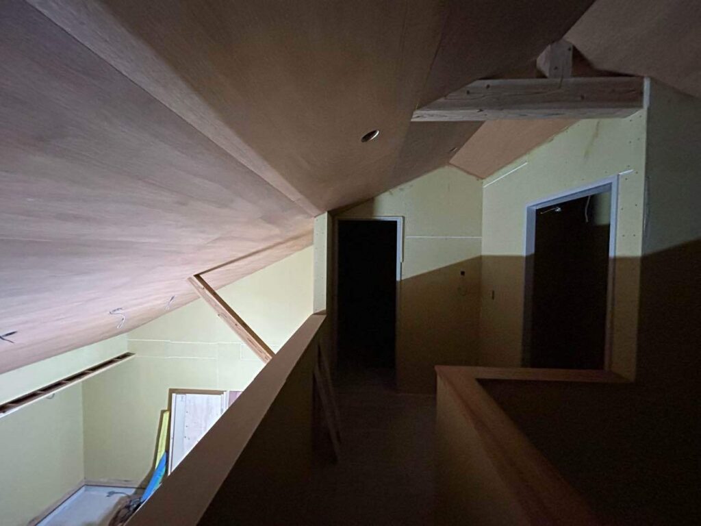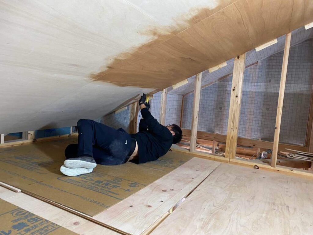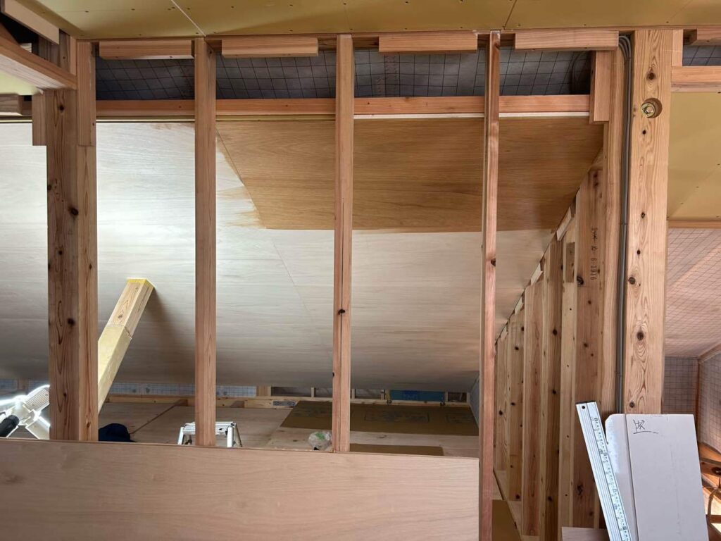 糸島の家、天井はラワン合板で空間をつくります。ラワン合板特有の木目を、バランスを見ながら張り合わせていきます。塗装はあらかじめ施すのではなく、空間としての色の調和を見ながら、張り合わせた後に塗装します。