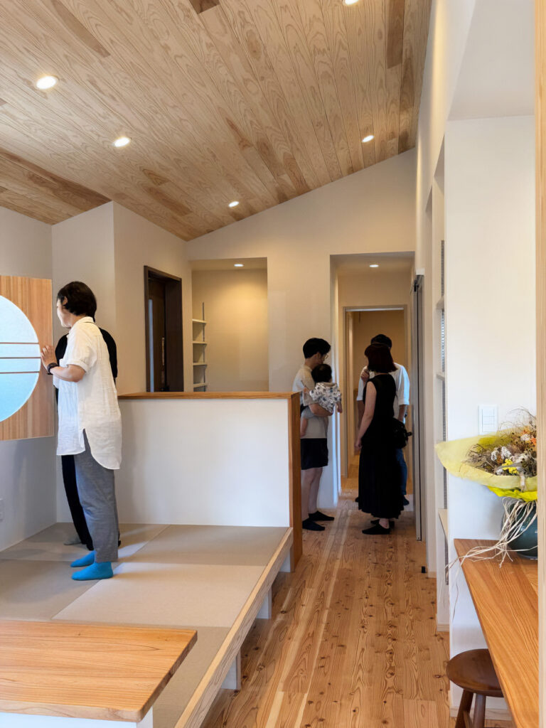 先日、栗田の家にて2日間完成見学会を行いました。以前からお住まいのご相談して頂いたご家族様や、今回初めてお会いするご家族様など多数の方にお越しいただきました。実際の空間や素材に触れながら、栗田の家のご家族の背景をお話しして、住まいや暮らしづくりの想像を膨らましていきます。なぜ、この仕様にしたのか、年数に応じてどう変化していくのか、住まいにどう向き合って、これからご家族の暮らしをどうしていきたいかなど1日では足りないぐらい、様々な会話が生まれます。