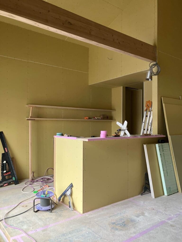 キッチン、リビングでは構造ができ、それぞれの空間の幅の広がりがカタチになってきました。よりリビングの空間が広く感じるように、ダクトの配管を調整し、キッチン部分まで吹き抜けを取り入れています。キッチン右から差し込む窓の灯りは、梁や棚を照し影が生まれ、家の中で一日の流れを感じます。ミリ単位のつくりの幅で、暮らしを想建していきます。そして、一日一日「できないが、できる。」の幅を増やし、シン・注文住宅へと繋げていきます。