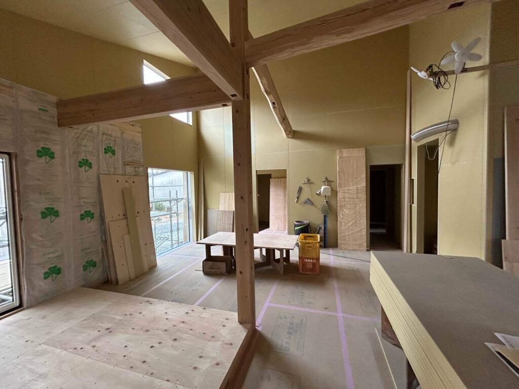 内観は断熱材やボードの施工が終わりつつあり、全体の輪郭がでてきました。外観の色味をそのまま投影せず、内観では暮らしの自然体をつくっていきます。丸太梁などの木本来の優しい色合いに、珪藻土クロスをあわせ「うきはの家」ならではの安らぎの場に。素材の在り方を一方向から見ずに、ご家族の話から生まれる暮らしに寄り添う方向から表現していきます。